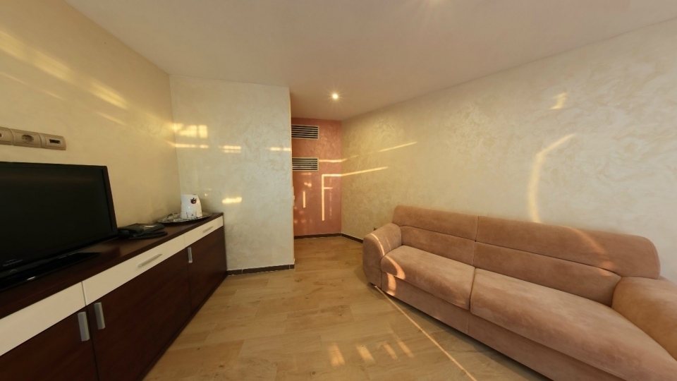 Оснащение номера: Двуспальная кровать, диван, обеденная группа, фен, тапочки, гладильный центр, телевизор – 3 шт., фригобар, шкаф для посуды, сервиз (6 персон), комплект столовых приборов (6 персон), сейф, wi-fi
