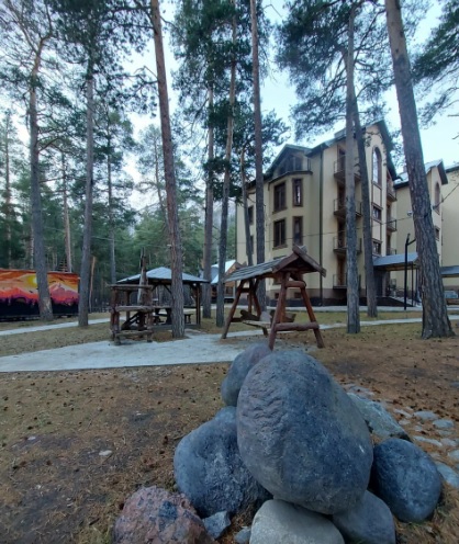 Четырехэтажный корпус отеля утопает в зелени хвойного леса и окружен величественными горными вершинами. В отеле представлено 35 комфортабельных номеров различных категорий, включая как уютные комнаты на цокольном этаже, так и роскошные двухуровневые апартаменты. Каждый номер оборудован отдельным санузлом и мини-кухней, оснащенной всей необходимой техникой, включая электрическую плиту. Для комфортного пребывания гостей в каждом номере установлены сплит-системы или кондиционеры.