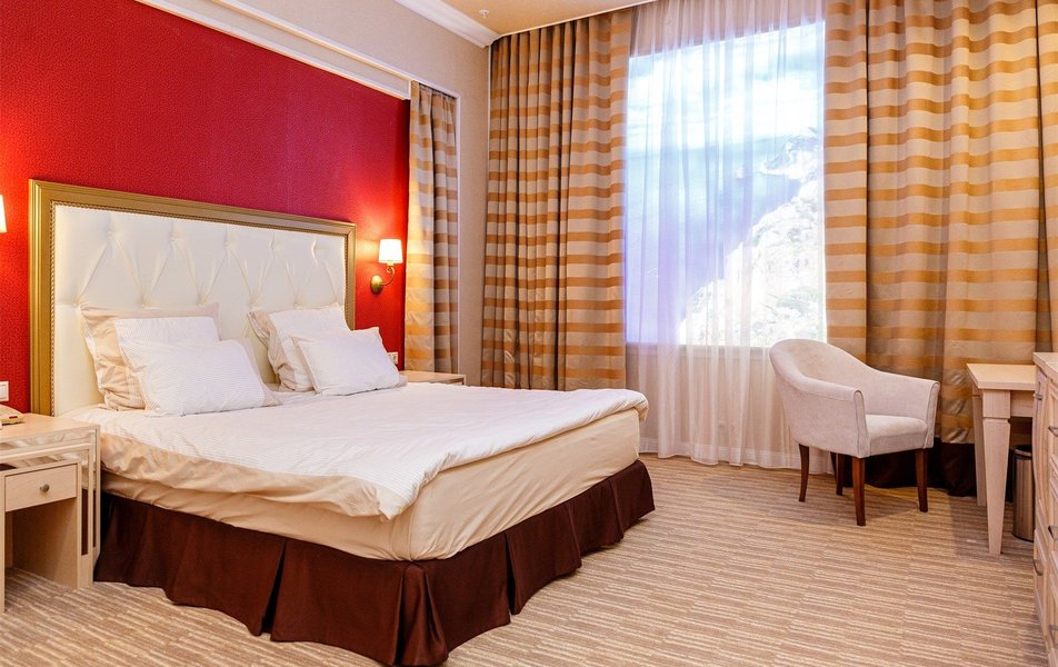 В номере: вешалка, зеркало, кровать двуспальная, прикроватные тумбочки, стол, стулья, шкаф, кондиционер, сейф, телевизор, телефон, холодильник