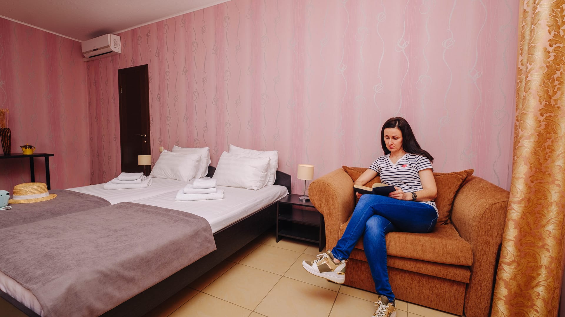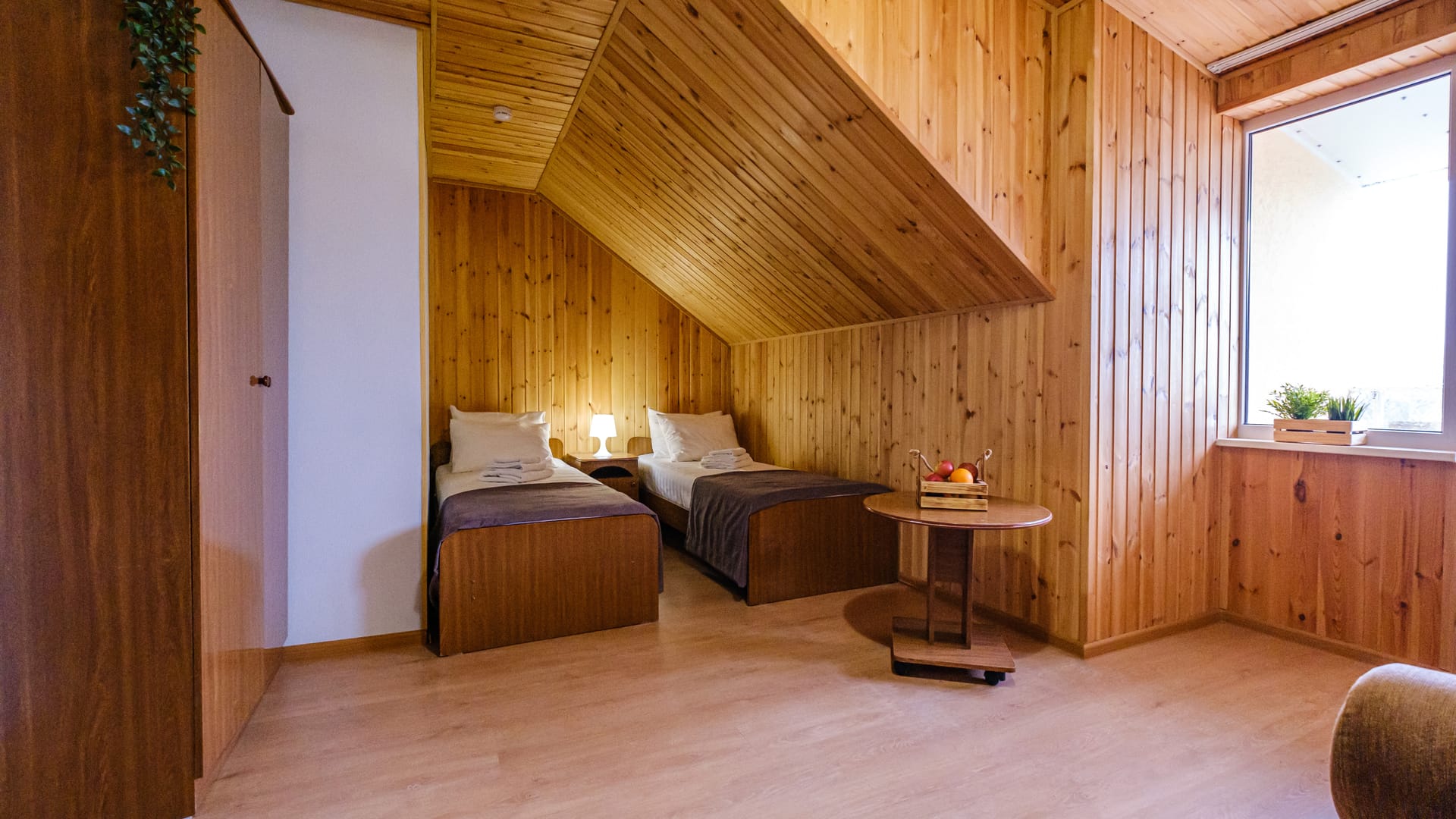 В номере: две односпальные кровати, прикроватные тумбы, стол, стулья, диван или кресло-кровать, шкаф, холодильник, плоский телевизор, кондиционер, чайник, утюг (на этаже)