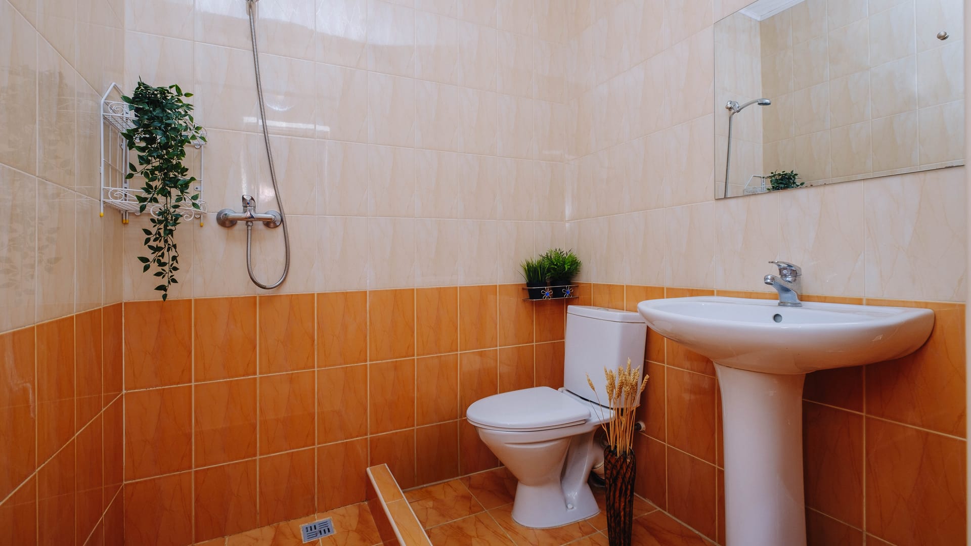 Санузел: душ, раковина, унитаз, фен, полотенца
