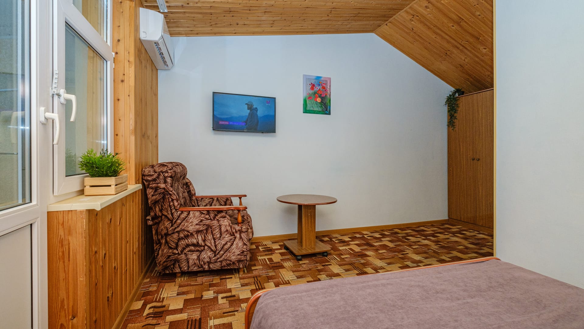 В номере: двуспальная кровать, односпальная кровать, прикроватные тумбы, стол, стулья, диван, журнальный стол, шкаф, холодильник, плоский телевизор, кондиционер, чайник, утюг (на этаже)