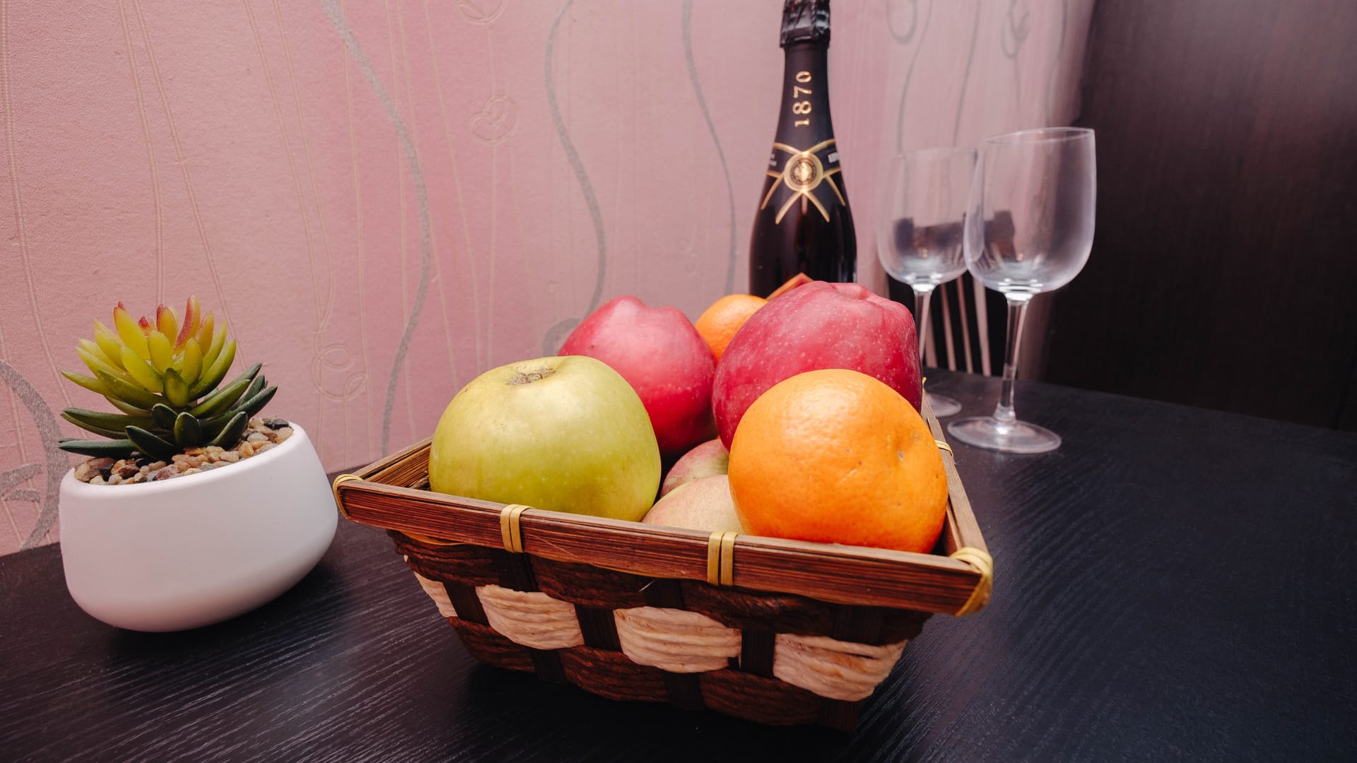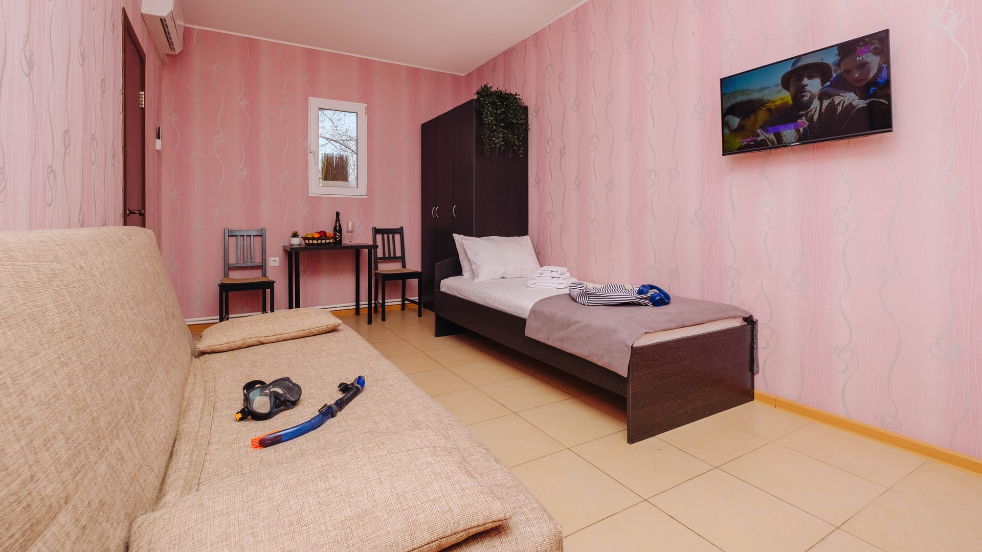 В номере: двуспальная кровать, прикроватные тумбы, стол, стулья, диван, шкаф, холодильник, плоский телевизор, кондиционер, чайник, утюг (на этаже)