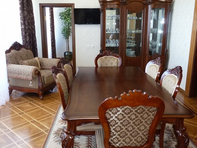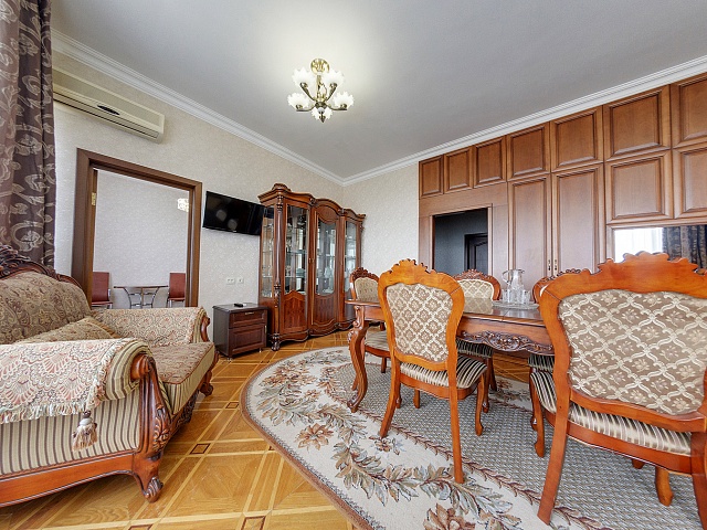 В номере: 2 комнаты, 2 кровати, диван, 2 кресла, тумба прикроватная, тумба TV, журнальный столик, стол туалетный с зеркалом, платяной и встроенный шкафы, обеденный гарнитур, рабочее место, телевизор, кондиционер, холодильник, телефон