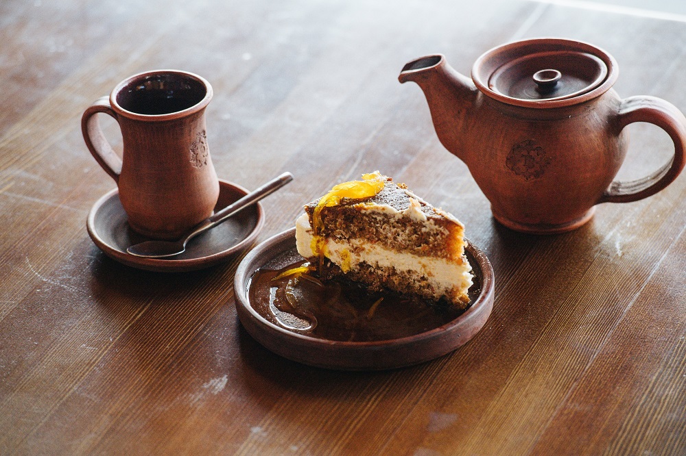 Интерьер ресторана сочетает в себе мебель из массива дерева, украшенные деревянные балками, глиняную посуду и текстиль, создавая благоприятное впечатление о месте. Каждая деталь помещения способствует общему уюту и выгодно смотрится в просторном зале под деревянным куполом.