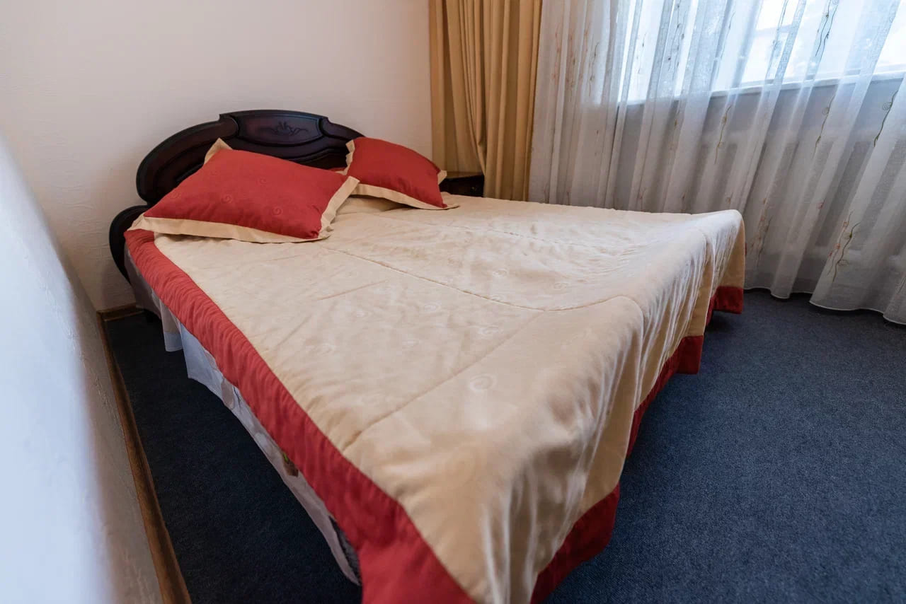 Оснащение номера: две односпальные кровати, прикроватная тумбочка, стол, стулья, шкаф, комод, диван, журнальный стол, телевизор, холодильник, чайный набор посуды, электрочайник